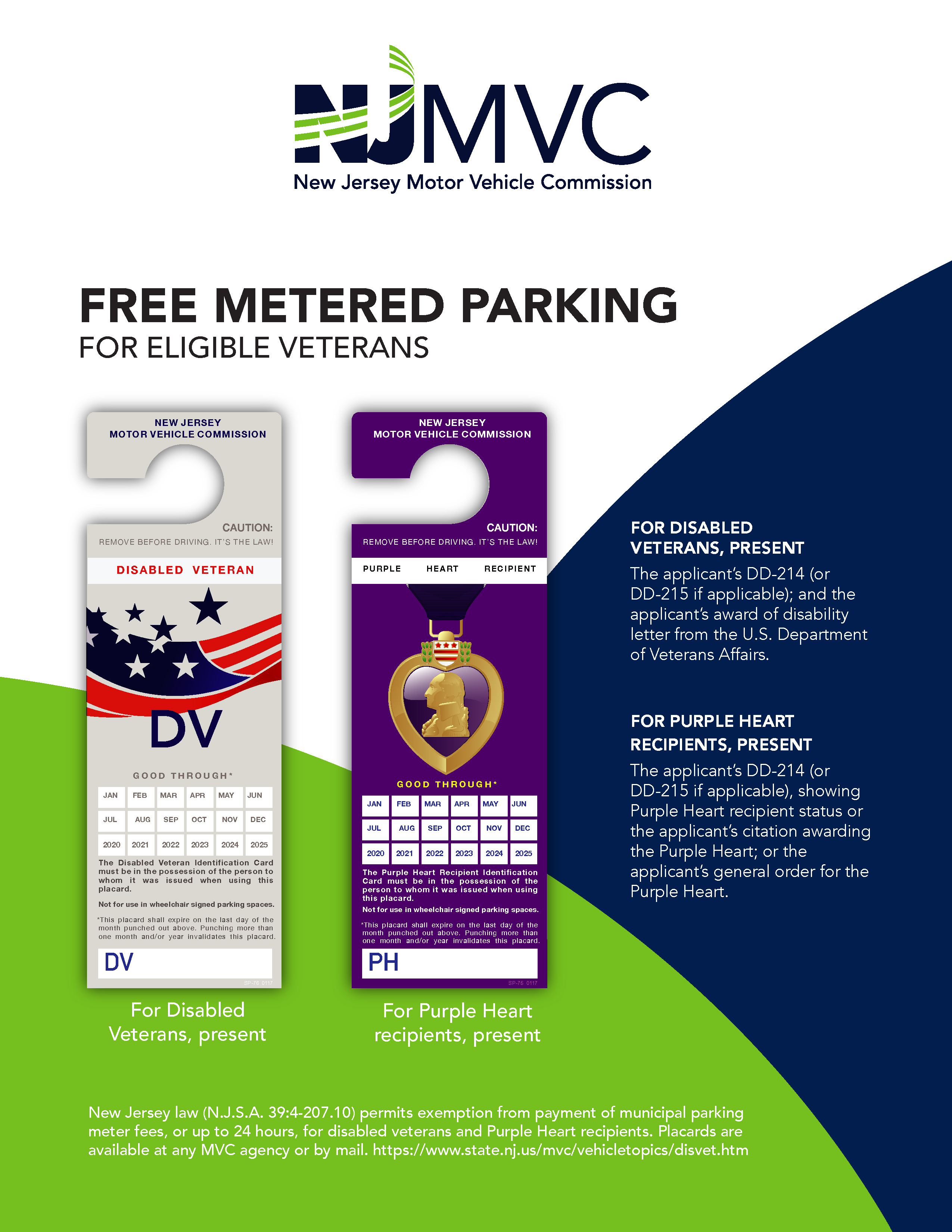 Your Mobile NJDMV  is also offering military disability & Purple Heart recipients placards for Free Metered Parking.